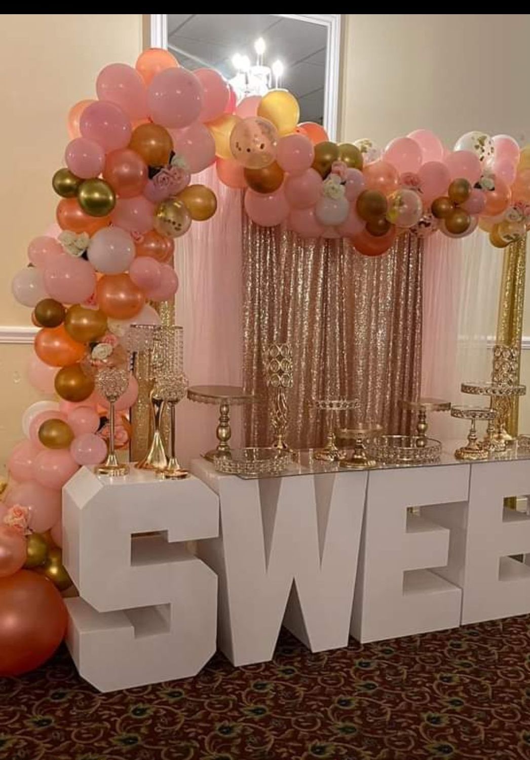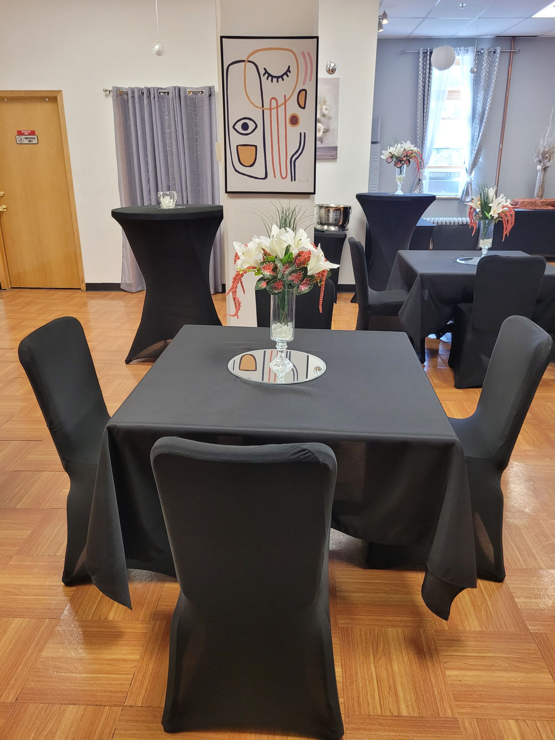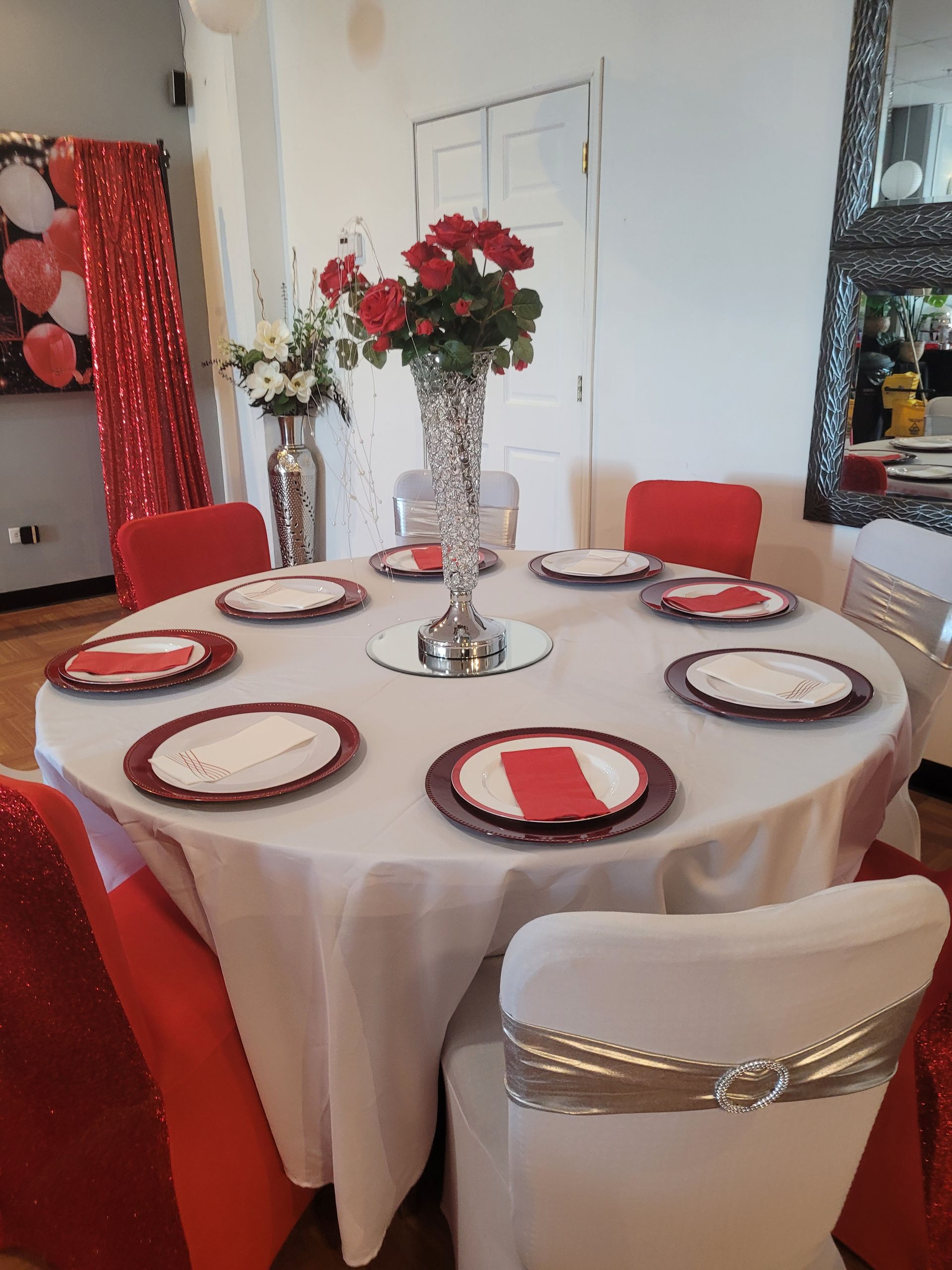 Table linen, runners or table overlay, chair covers and chair sashes, centerpieces for tables (basic)-rental only two-8ft and one-6ft tables for food and sweets. One-5ft table for beverages.